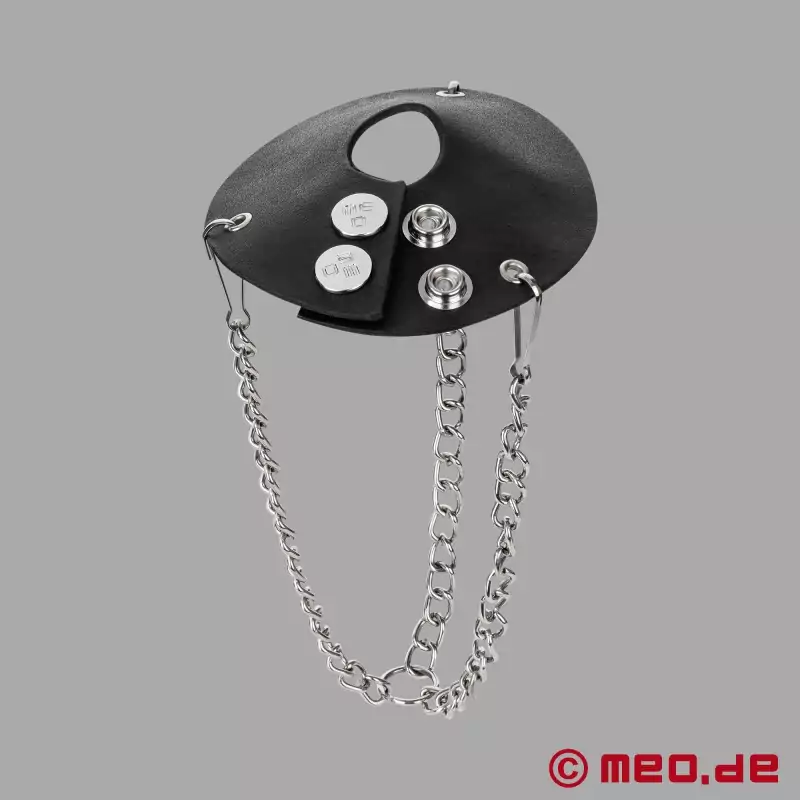 Super-cuir, chaîne en acier chromé lourd et une finition de qualité supérieure. Que rêver de mieux !?! Avec plusieurs fermetures à rivets, ces lests à couilles pourront s’ajuster facilement à n’importe quel gabarit.