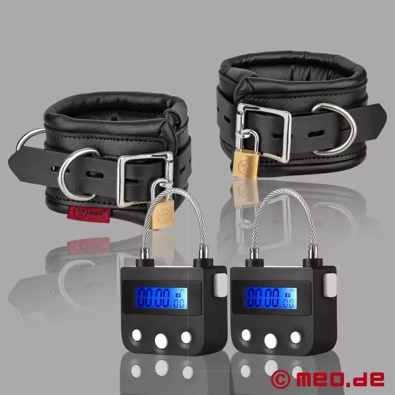 Zestaw składa się z: 2 blokad czasowych MEBOND bondage i pary zamykanych kajdanek na kostki.