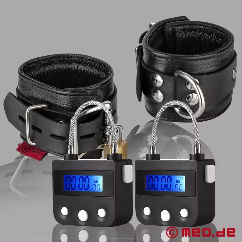 Skórzane kajdanki MEO mają elektroniczną blokadę czasową, która blokuje się automatycznie do 100 godzin.