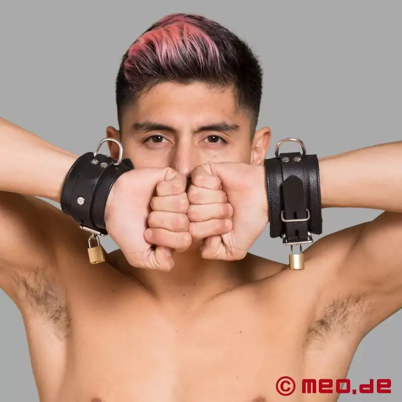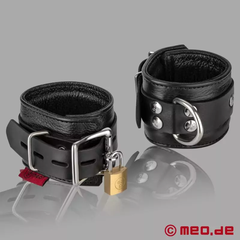 Nasze wykonanie nadaje skórze ciepłą powierzchnię i przyjemny dotyk. Garbowana skóra MEO jest szczególnie drobnoziarnista i wytrzymała. Charakter skóry jest zachowany w naszych kajdankach, a naturalne nierówności i blizny nie są sztucznie ukrywane. Nasze kajdanki na nadgarstki są bezpiecznie zapinane za pomocą nitowanych pasków. Solidna specjalna metalowa klamra z naszymi dopasowanymi zamkami bezpieczeństwa oferuje dodatkową opcję blokady.