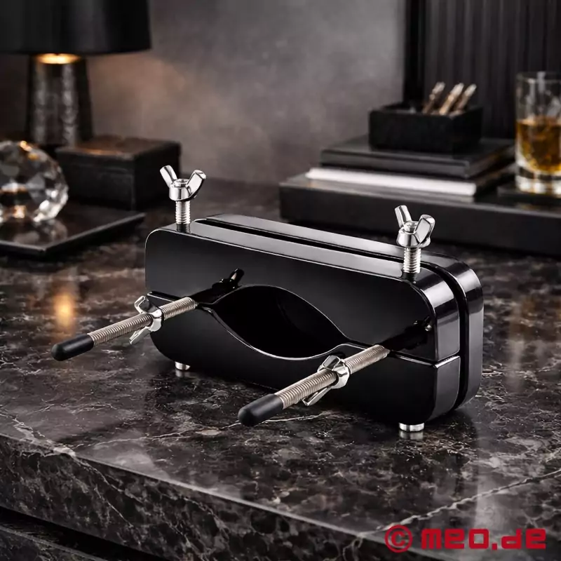 Czarna prasa do jąder od Dr Sado składa się z płyty bazowej i płyty dociskowej, która służy jako ściskacz. Obie płytki mocno ściskają wrażliwe jądra, gwarantując intensywne orgazmy. Nacisk można indywidualnie regulować za pomocą dwóch śrub skrzydełkowych! Każdy obrót zwiększa efekt i przyjemność. Czego chcieć więcej?