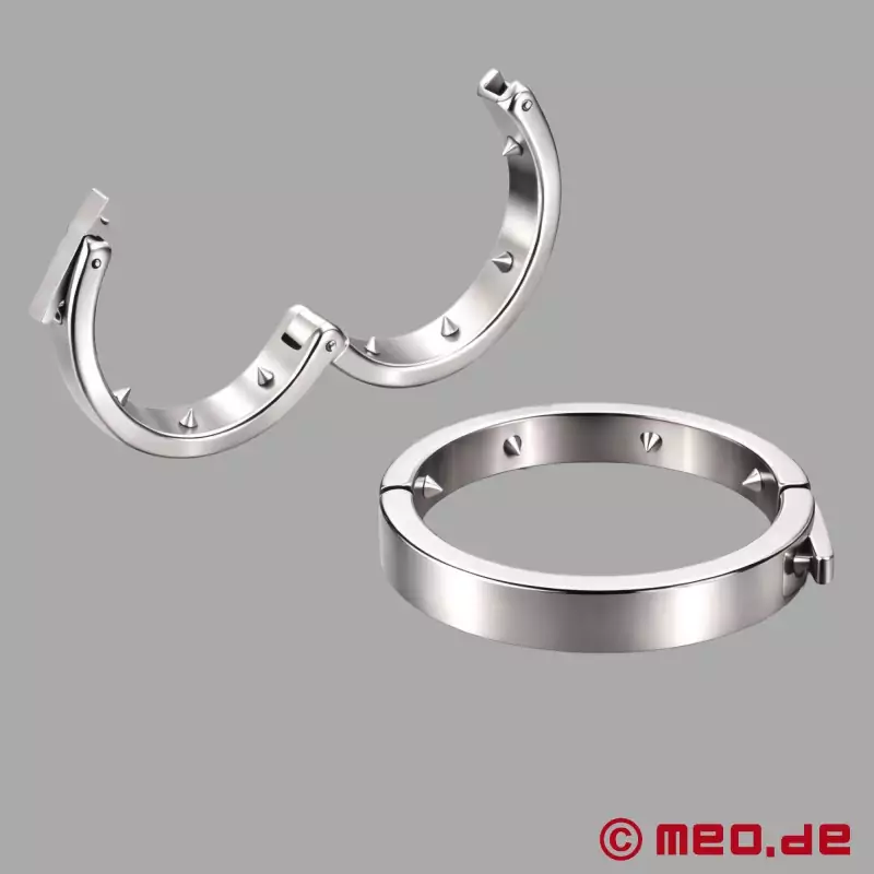 As I inspected the stainless steel ring over I couldn’t help but notice the solid six spikes firmly surrounding the circumference of the inner steel. Opening the ring up is done by releasing the clasp where there is a strong hinge positioned on the bottom of the glans ring. The outer edge of the ring has a shiny finish to the steel; there is the MEO logo to complete the ring appearance.i