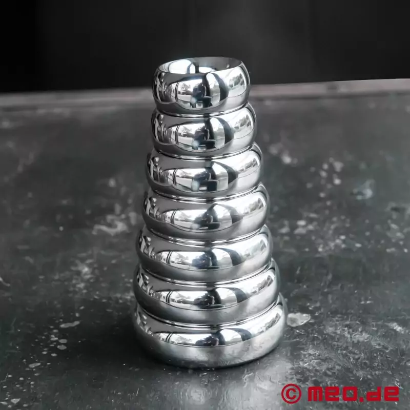 Diese Ringserie ist sehr beeindruckend. Begonnen habe ich mit dem engsten Eichelring, der ein sehr gutes Bild abgibt und für eine dicke Eichel sorgt. Eines der Fotos zeigt ein total beringtes männliches Genital. Den nun erworbenen Ring mit 35 mm will ich hinter dem Eichelring tragen. Hoffentlich ist meine Erektion kräftig genug, diese Masse zu stemmen. Ich freue mich schon auf die großen Augen meiner Dame, wenn sie die Doppelberingung sieht und später in sich fühlt. Der nächste Schritt ist dann der Cockring, wie ihn der Herr auf dem Bild auch trägt.