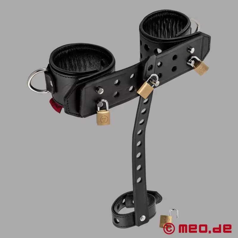 MEO® Use & Abuse 2.0 jest wykonany z wysokiej jakości pelletu i został zaprojektowany z myślą o stabilności i komforcie. Szerokie na 5 cm, wyściełane skórą kajdanki na nadgarstki wygodnie dopasowują się do nadgarstka i można je elastycznie regulować. Odległość między nadgarstkami można indywidualnie regulować - od bardzo blisko do około 10 cm, w zależności od pożądanego ograniczenia i rodzaju gry.