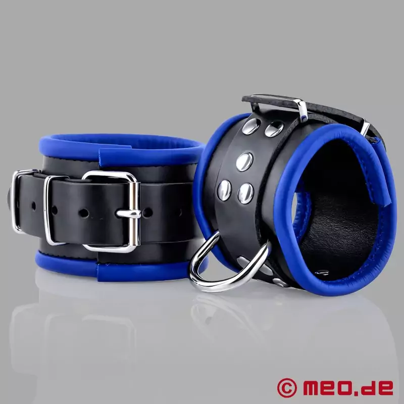 Die blau/schwarzen Fußfesseln von MEO sind sehr stabil, lassen sich gut schnüren und halten dann auch sehr gut kräftiger Gegenwehr stand.