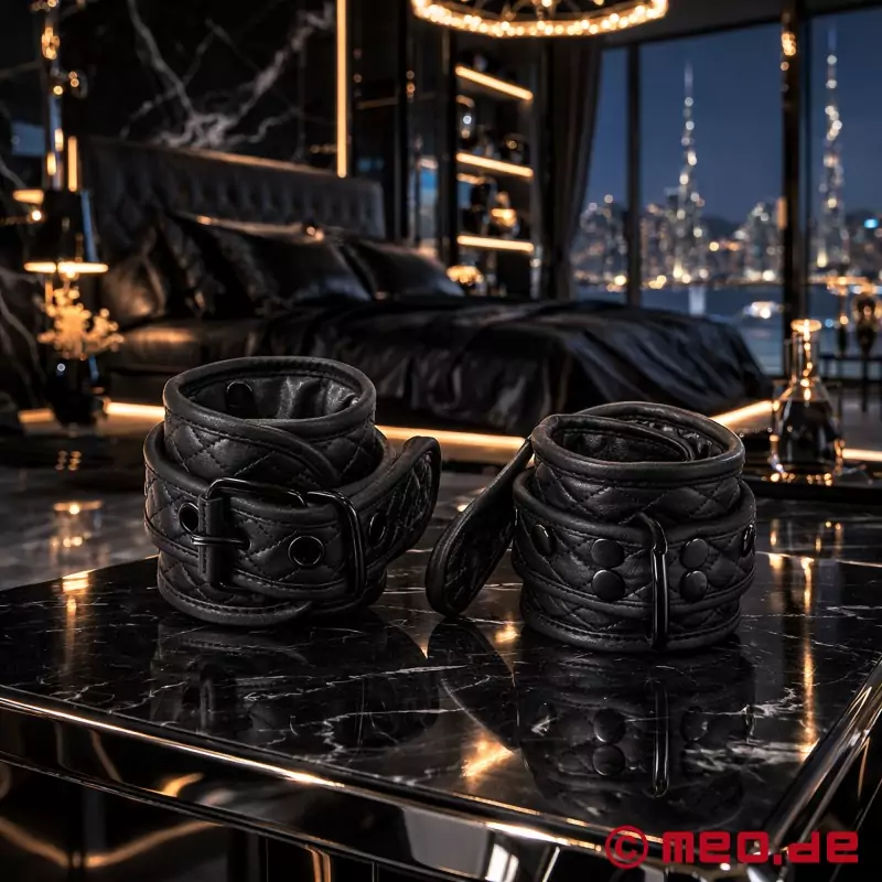 Luksus, komfort i profesjonalizm połączone w jednej parze kajdanek na kostki: Mankiety na kostki Black Diamond od MEO® ergonomicznie przylegają do kostek dzięki miękko wyściełanej skórze bydlęcej i można je precyzyjnie dopasować zarówno do wąskich, jak i mocnych kostek. Charakterystyczne diamentowe pikowanie stabilizuje wyściółkę kajdanek na kostki, a pokryte czarną powłoką ćwieki i sprzączki dopełniają elegancki wygląd black-on-black. Dzięki starannemu wykonaniu, wysokiej jakości skórze i przemyślanym detalom, wiązanie z naszymi luksusowymi kajdankami na kostki jest nie tylko przyjemniejsze, ale także lepsze i bezpieczniejsze.