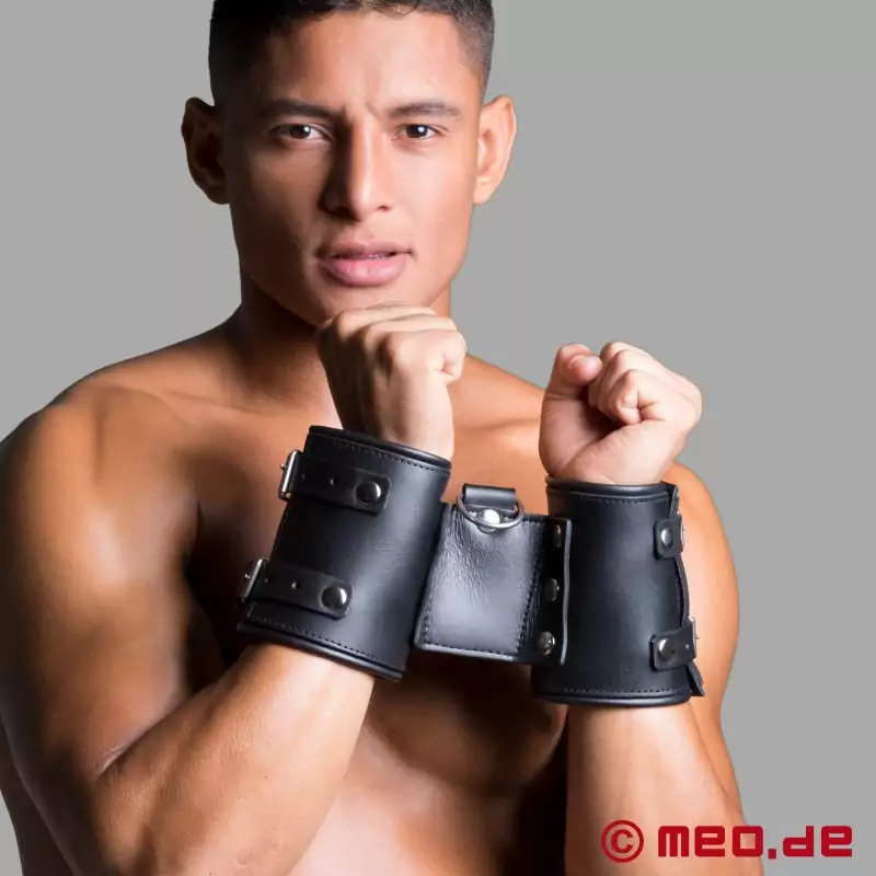 Skórzane kajdanki na nadgarstki są mocno połączone ze sobą za pomocą trapezowej wkładki ze skóry (mono cuffs) i są bardzo wygodne w noszeniu. Przyjemnie wyściełane mankiety są wyposażone w sprzączki, dzięki czemu można je precyzyjnie dopasować do nadgarstków.