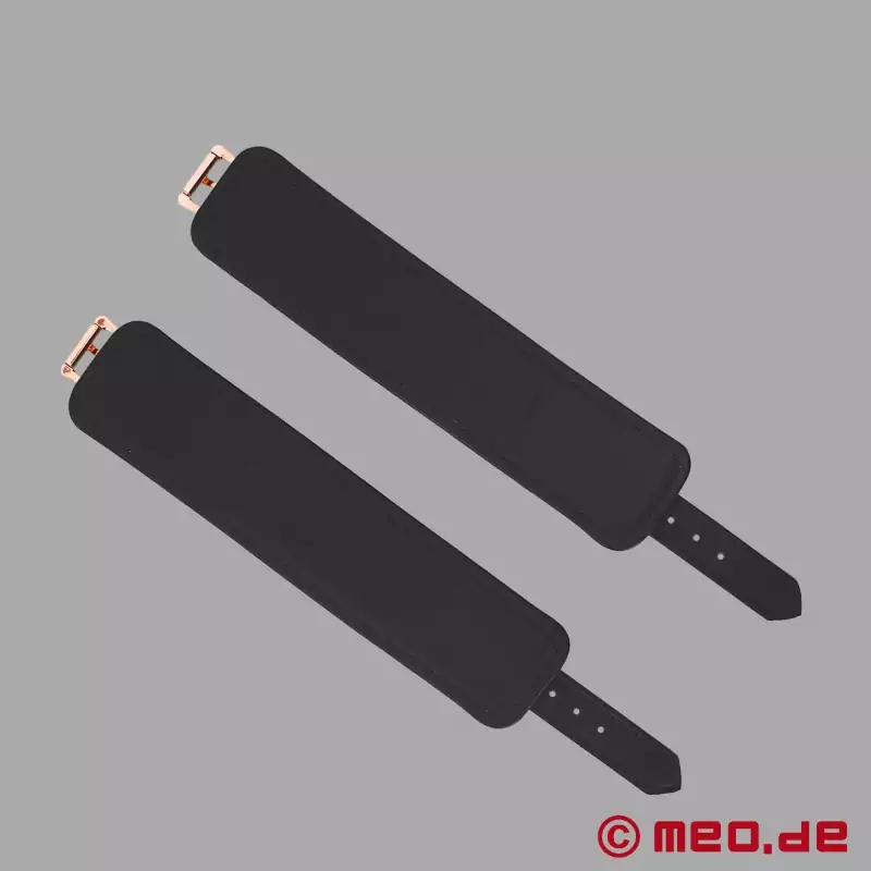 Dzięki regulowanym zapięciom na klamrę, kajdanki można szybko założyć i dopasować do swoich potrzeb. Solidny łańcuszek z karabińczykiem utrzymuje kajdanki mocno i bezpiecznie razem, ale można je również całkowicie zdjąć. Japońska skóra bydlęca, klamry w kolorze różowego złota i nity są szczególnie wytrzymałe, dzięki czemu kajdanki są nie tylko ozdobnym dodatkiem do bondage, ale także nadają się do dłuższych sesji BDSM. Dzięki starannemu wykonaniu i miękkiej wyściółce ze skóry jagnięcej nappa, kajdanki mogą pozostać na nadgarstkach przez dłuższy czas, nie powodując dyskomfortu dla Sub. Na kajdankach znajdują się 3 D-ringi do mocowania łańcucha łączącego lub innych akcesoriów, takich jak liny, blokady czasowe lub łańcuchy.