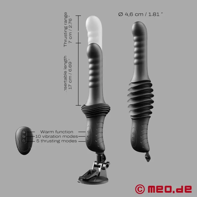 Możesz trzymać MEO® DeepThrust™ w dłoni jak klasyczny wibrator z funkcją pchającą i prowadzić go w ukierunkowany sposób lub zamocować go na miejscu za pomocą mocowania z przyssawką i pozwolić mu wykonywać swoją pracę, zapewniając intensywną penetrację bez użycia rąk. Miękki, jedwabiście matowy silikonowy trzon o długości ok. 17 cm wygodnie wsuwa się w odbyt lub pochwę, podczas gdy dildo mocno pcha do przodu i do tyłu do ok. 7 cm. Pięć programów pchnięć i dziesięć trybów wibracji zapewnia, że otrzymasz wszystko, czego chcesz, od powoli zwiększającej się penetracji do maksymalnie intensywnych, mocnych pchnięć.