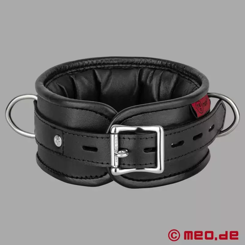 Całkowicie czarna obroża BDSM jest wykonana z mocnej skóry bydlęcej i ma 3 pierścienie do mocowania akcesoriów do bondage. Sub może beztrosko nosić obrożę BDSM przez długi czas podczas zniewolenia i cieszyć się maksymalnym komfortem.