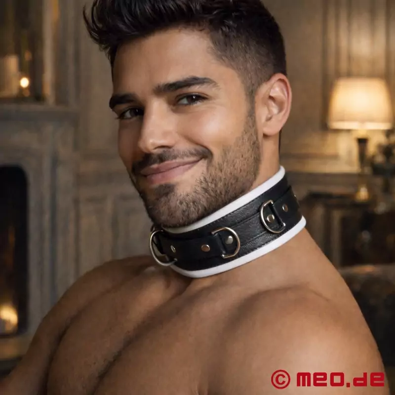 Obroża BDSM z czarno-białej skóry zachwyca klasyczną elegancją i subtelną kolorystyką. Sub korzysta z wysokiego poziomu komfortu, nawet jeśli obroża BDSM musi być noszona przez długi czas. Nasza obroża BDSM jest wyposażona w 3 pierścienie, które wyraźnie pokazują, że sub należy do kochanki lub mistrza, tak jak w opowieści o O.