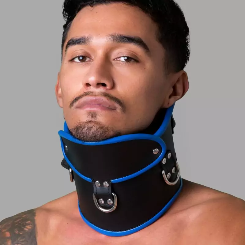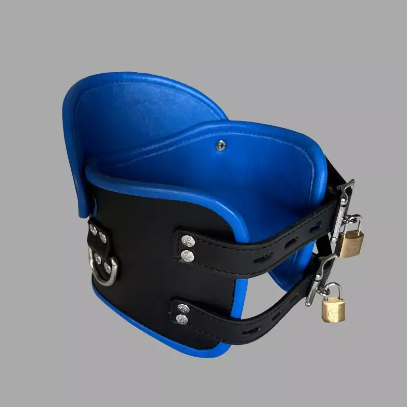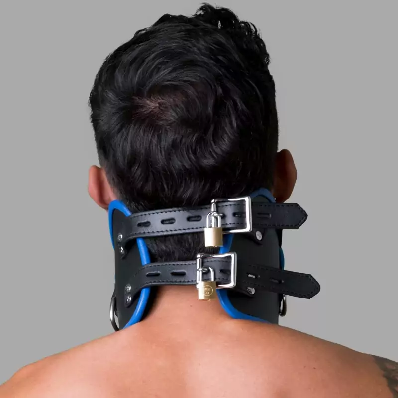 Ciesz się dominacją i uległością podczas bondage dzięki naszej zamykanej, czarno-niebieskiej skórzanej obroży Posture Collar. Ta obroża BDSM jest wykonana z wytrzymałej skóry, a jej ciasne dopasowanie zapewnia, że głowa i szyja użytkownika są unieruchomione w pozycji pionowej.