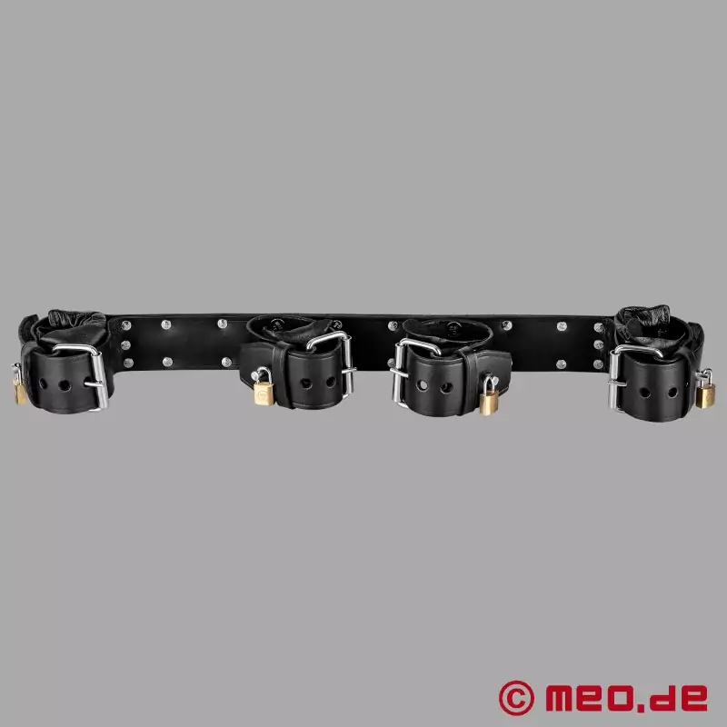 Popularne akcesorium do bondage składa się z czterech mocno przymocowanych, wygodnie wyściełanych skórzanych kajdanek i stabilnego łącznika, który utrzymuje nadgarstki i kostki w wyraźnej pozycji rozłożonej. Zintegrowany metalowy element utrzymuje nadgarstki i kostki w jasno określonej pozycji, tworząc efekt podobny do sztywnego drążka rozporowego. Kajdanki na ręce i kostki mają regulowany rozmiar, są solidnie wykonane i zaprojektowane z myślą o dłuższych sesjach bondage. Górne paski mają zamykane stalowe klamry z otworem na kłódkę. Zestaw zawiera cztery kłódki, które blokują się w ten sam sposób, dzięki czemu zarówno kajdanki, jak i kajdanki na kostki można bezpiecznie zamknąć za pomocą jednego klucza.