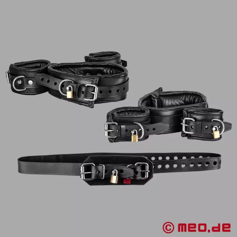 Ciężki, wyściełany skórzany zestaw kajdanek MEO® szybko ustawi Twojego Sub w idealnej pozycji Hogtie. Całkowicie nieruchomy i bezbronny na łasce Twoich dominujących fantazji!