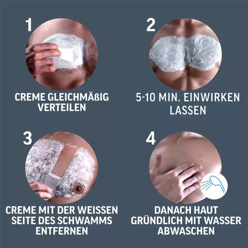 Przeczytaj i postępuj zgodnie ze wszystkimi ważnymi instrukcjami przed użyciem. Nałóż krem równomiernie, aby całkowicie pokryć włoski. Efekt zacznie działać po 3 minutach. Po 3 minutach przetestuj niewielki obszar, aby sprawdzić, czy włosy można już usunąć. W razie potrzeby pozostaw krem na kilka minut, ale nie dłużej niż 6 minut. Następnie usuń krem i dokładnie spłucz skórę wodą.