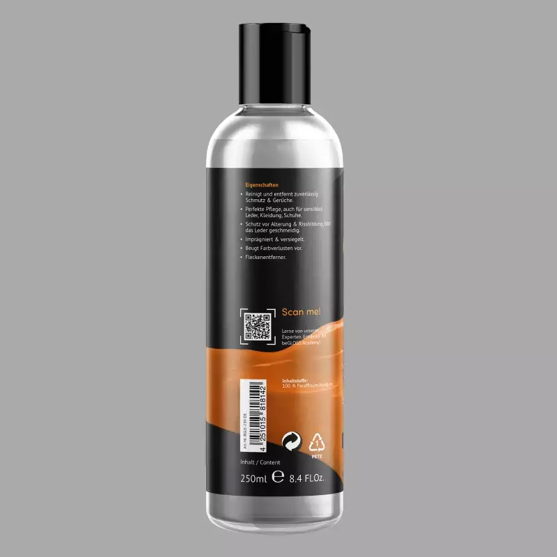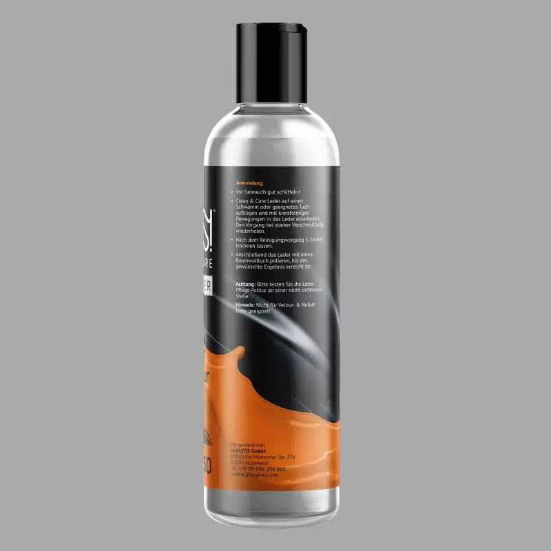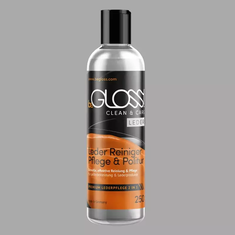beGLOSS® Clean & Care™ to produkt do pielęgnacji skóry 2 w 1 do produktów ze skóry gładkiej. Pomaga utrzymać elastyczność i miękkość pelle oraz wspiera ochronę przed starzeniem, blaknięciem i pękaniem. Wyprodukowano w Niemczech.