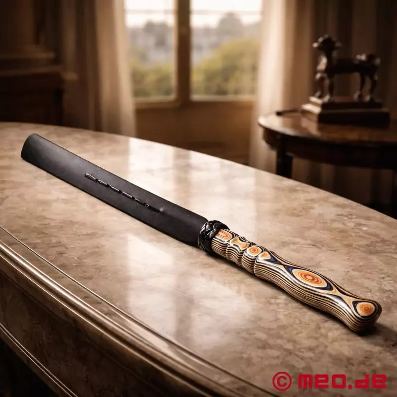 Anatomicznie ukształtowana drewniana rączka doskonale leży w dłoni i oferuje nie tylko wizualną, ale także dotykową przyjemność dzięki pięknemu usłojeniu. Obszerny ozdobny skórzany węzeł łączy uchwyt ze skórzanym slapperem BDSM, który jest wykończony eleganckimi poziomymi ozdobnymi szwami. Przy całkowitej długości około 59 cm i wadze około 300 gramów, to akcesorium do Impact Play oferuje idealną równowagę między kontrolą a skutecznością, aby każde uderzenie było niezapomniane.