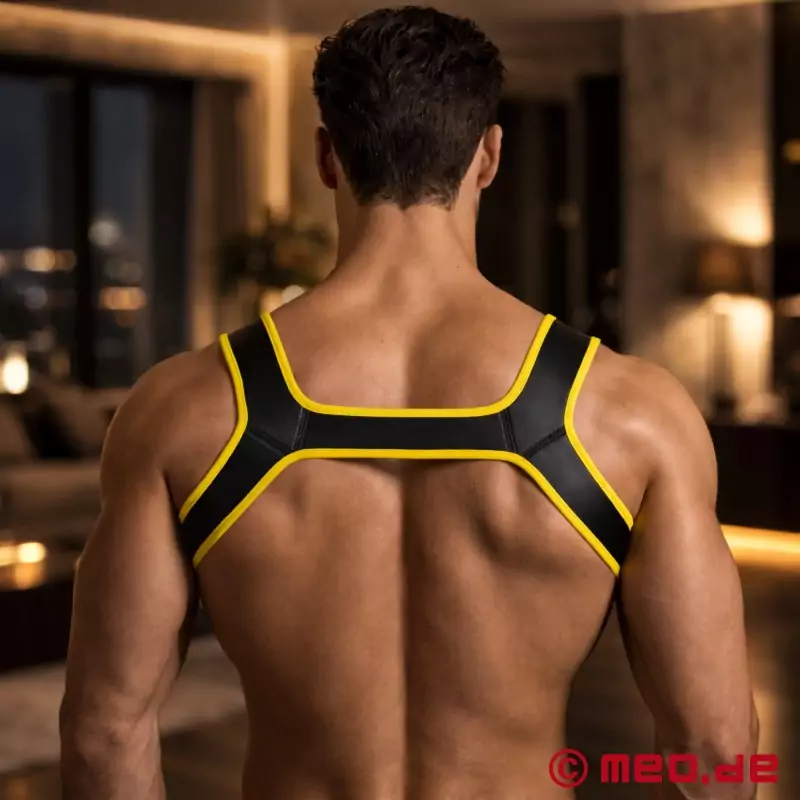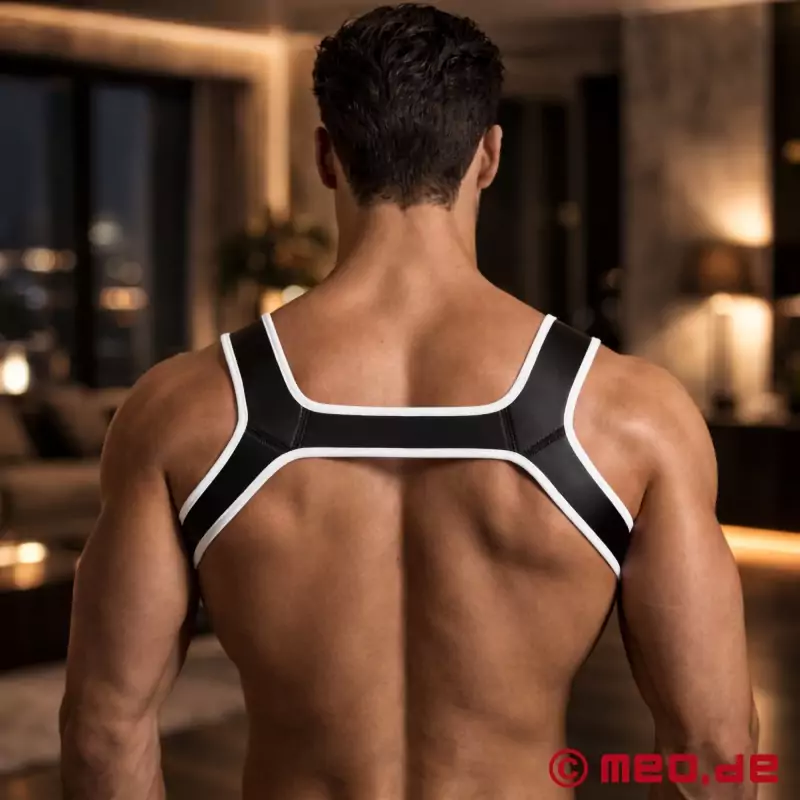 Ta uprząż na górną część ciała łączy modę fetyszową, odzież klubową i odgrywanie ról, tworząc uderzające akcesorium o wysokiej wartości rozpoznawczej. Kontrastujące kolorowe krawędzie nawiązują do symboliki znanego na całym świecie Hanky Code i sprawiają, że uprząż jest pewną siebie deklaracją kolorystyczną.
